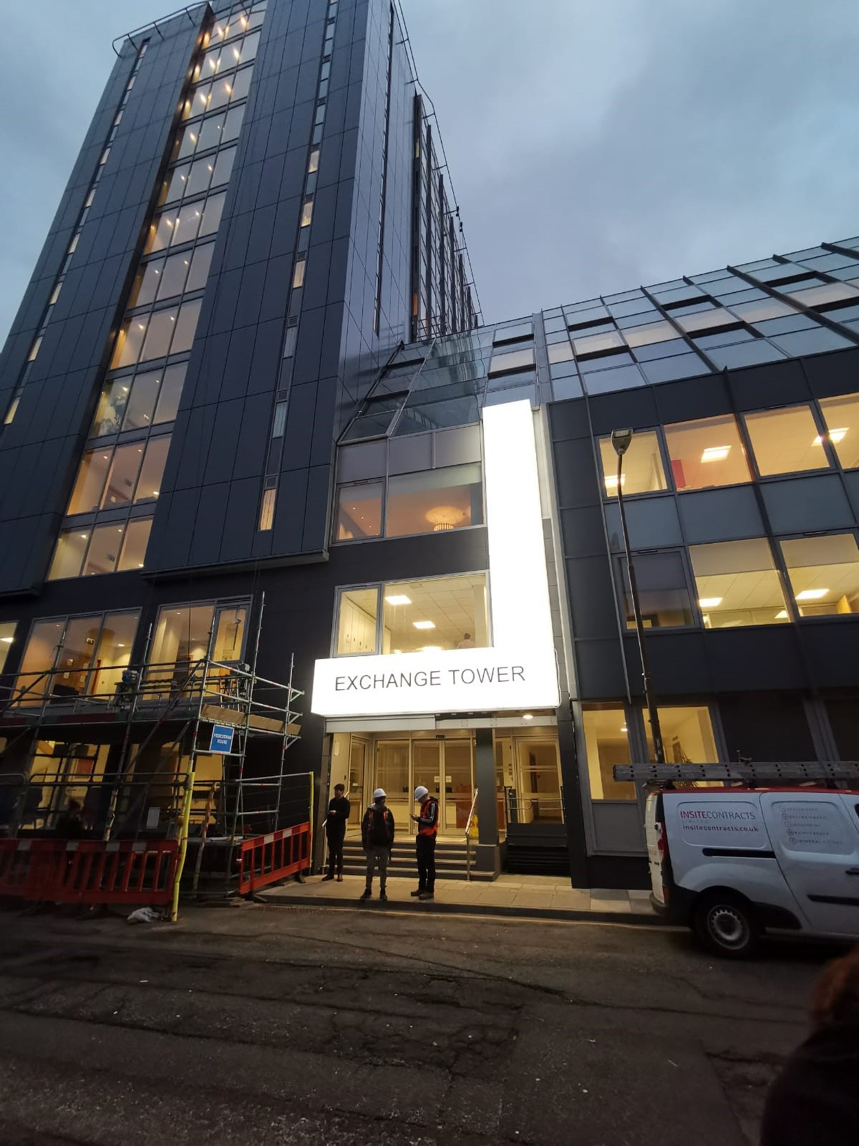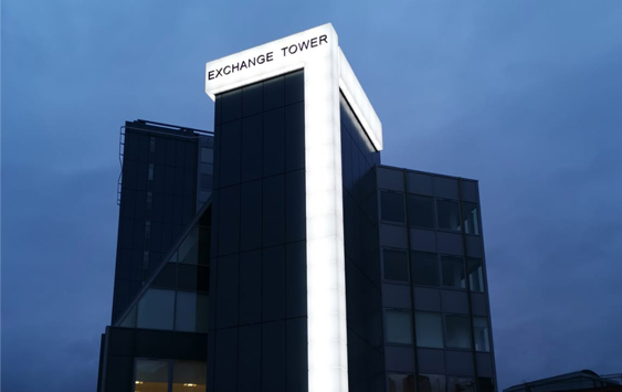 Der Exchange Tower befindet sich in prominenter Lage im Stadtzentrum von Edinburgh und ist ein modernes Arbeitsgebäude, das eine Reihe von modernen, offenen Büros beherbergt. Als Teil des umfassenden Renovierungsprojekts wurde das Äußere des Gebäudes komplett neu gestaltet. Über dem Haupteingang des Exchange Towers wurden 1 m x 1,5 m große 3D-Würfel installiert, die sich auch um die Spitze des Gebäudes winden und die volle Höhe von 80 Fuß erreichen.
