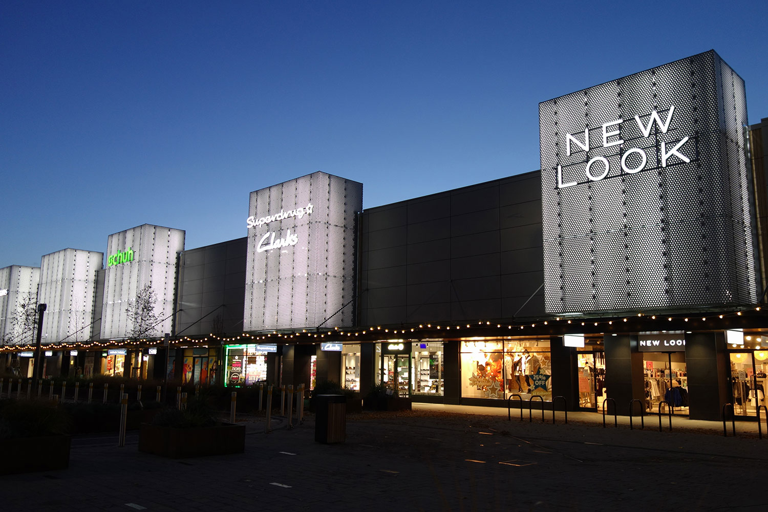 De units staan als futuristische pilaren bij de winkelingangen en zijn verder verbeterd met SloanLED SignBOX III van Applelec Supply, die krachtige achtergrondverlichting leveren.