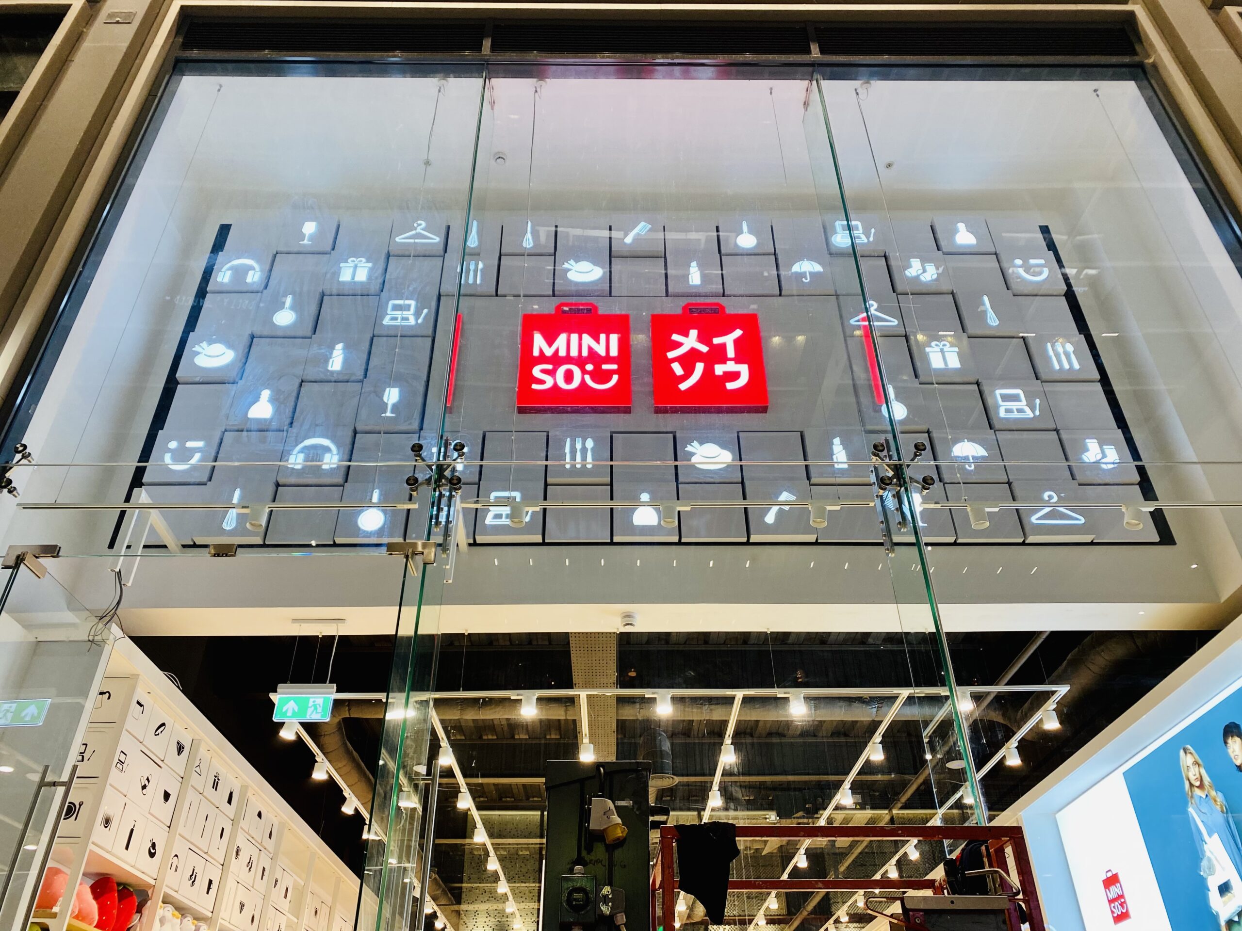 De indrukwekkende ruimte, die bestaat uit een enorme wand van 28 m² op hoog niveau bij de ingang van de winkel, werd gebruikt voor een gedurfde en stijlvolle winkelpresentatie. Designs creëerde 84 individuele lichtbakken met sjabloonmotieven die een speelse mix van minimalistische pictogrammen uitbeelden. De ontwerpen weerspiegelen het merk Miniso en hun dynamische productassortiment en werden op verschillende dieptes gemaakt om een interessant 3D-effect te bereiken.